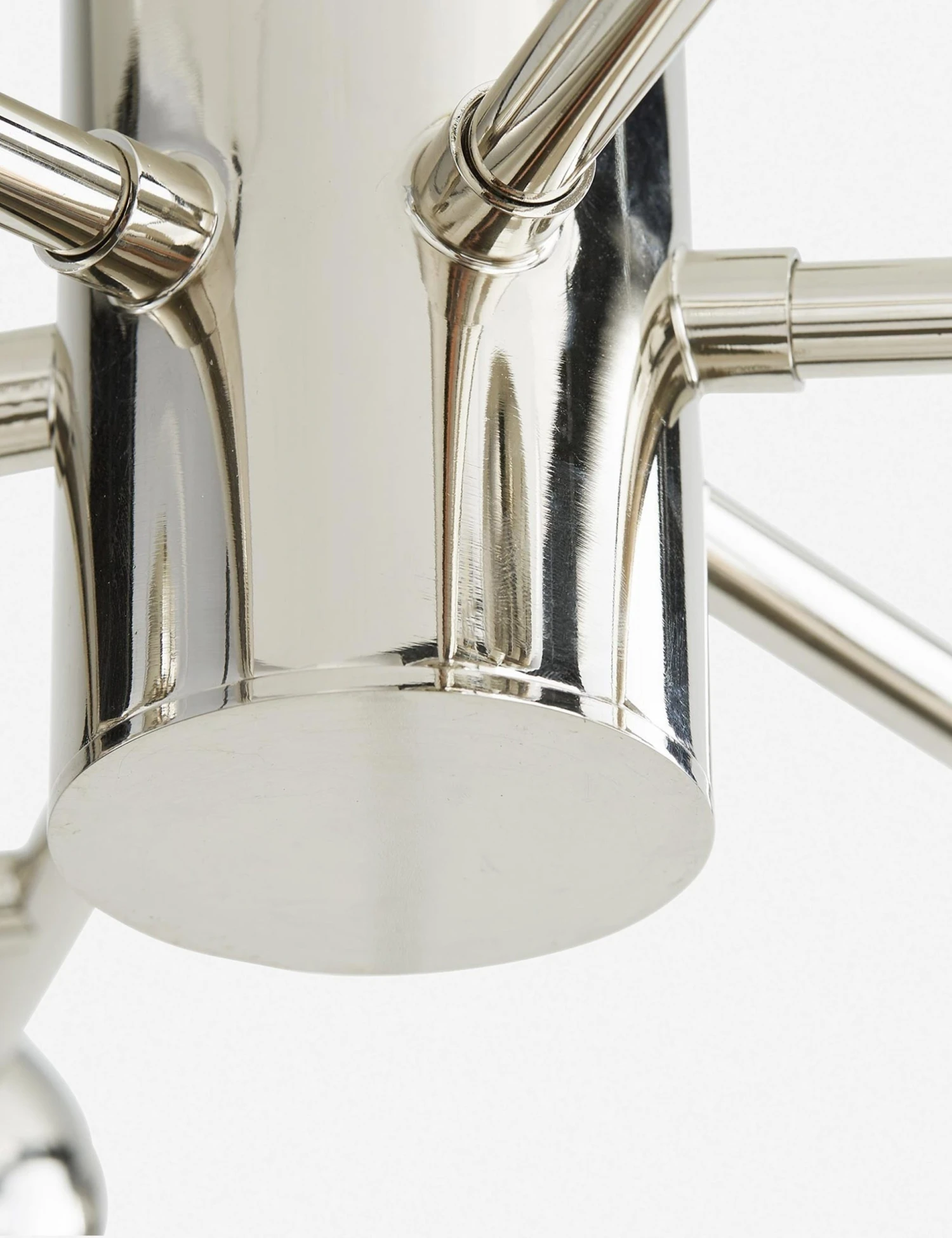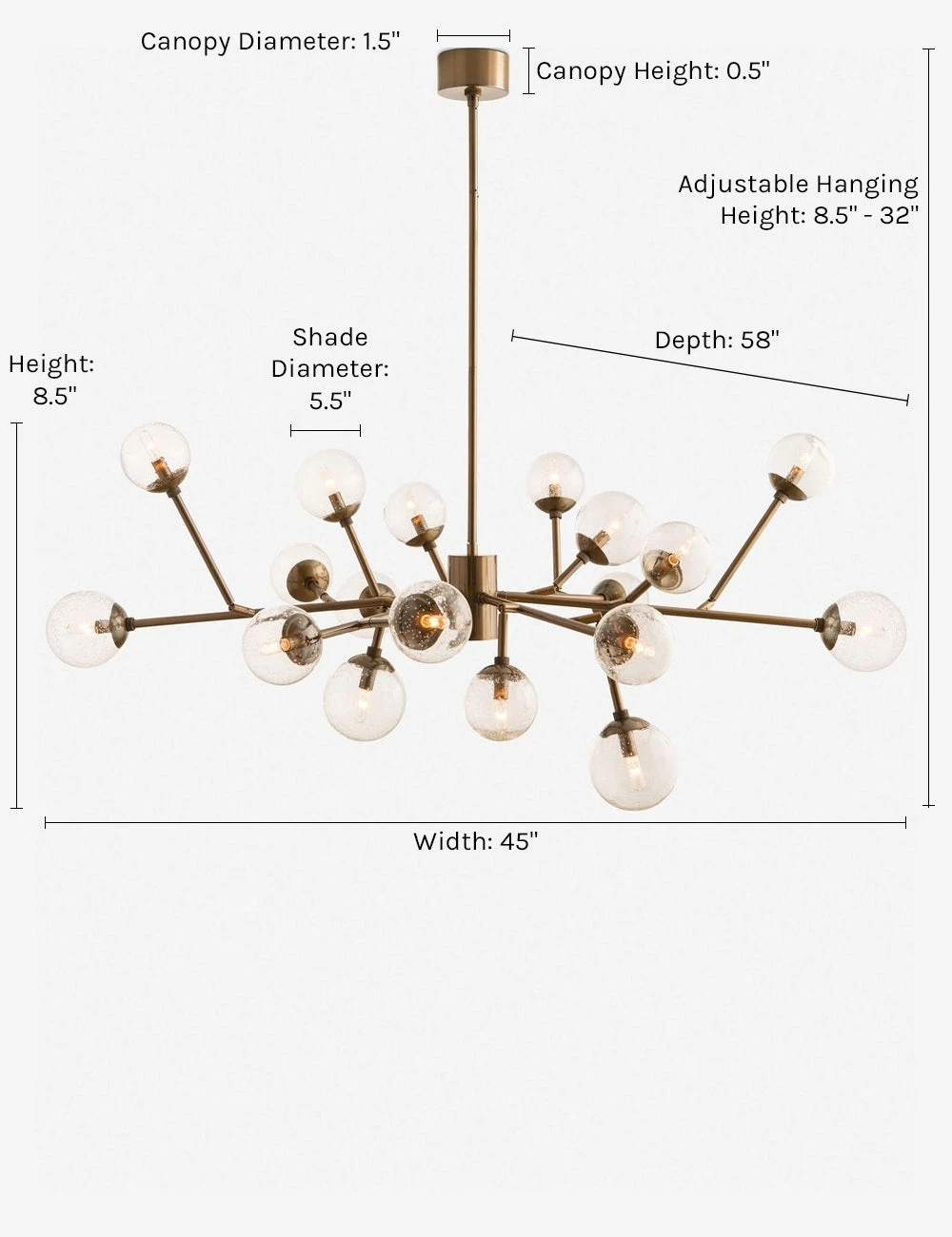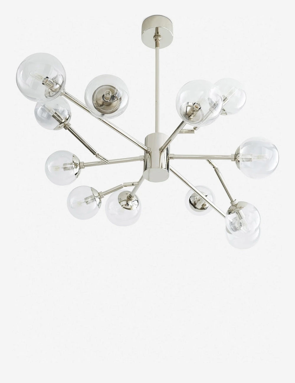 An extended profile and twelve angular arms make this chandelier perfect for a grand lighting statement over a dining room table or open-plan living space. The steel body and glass globes come together in a bright and polished modern chandelier design that will transform your space with a brilliant pool of light.