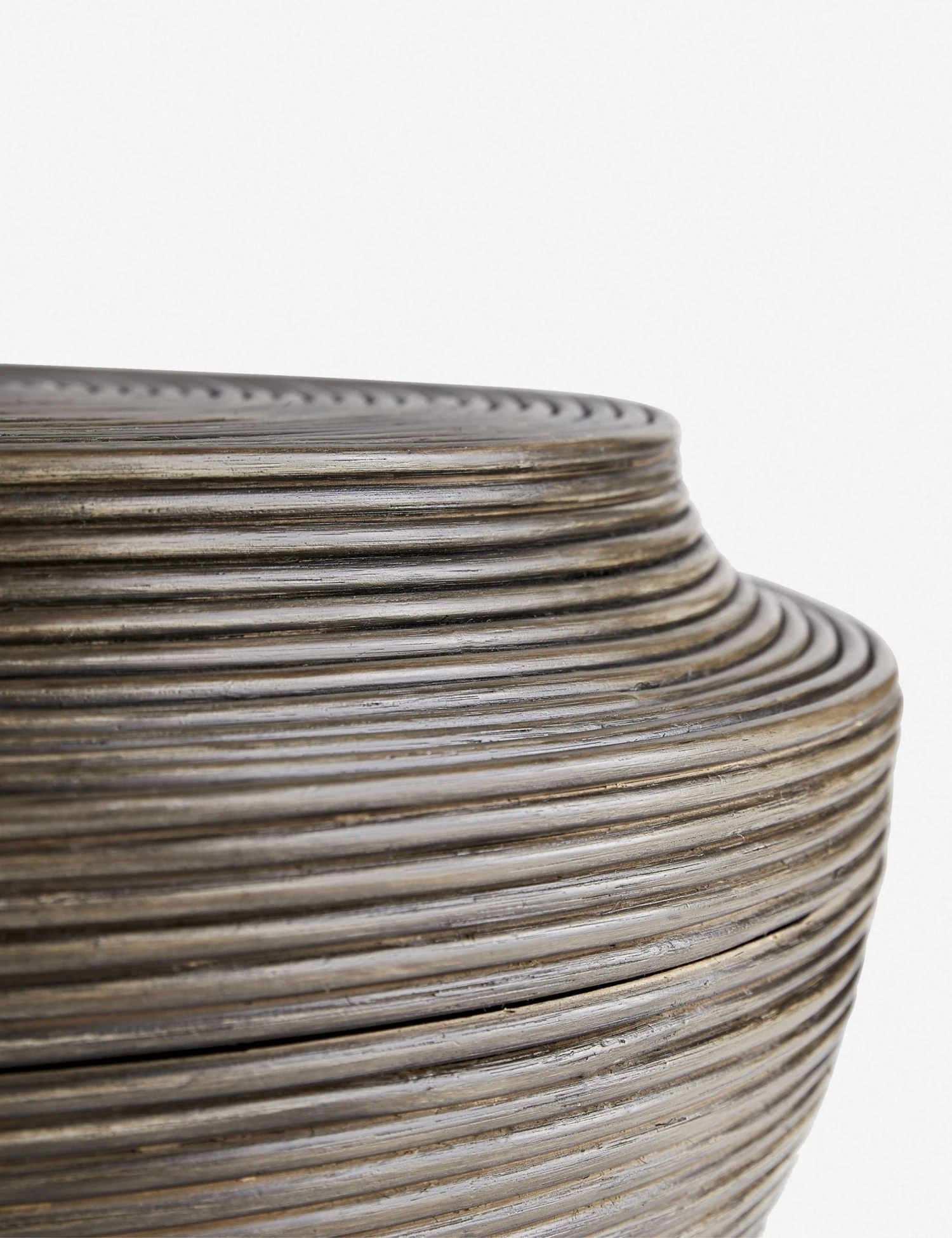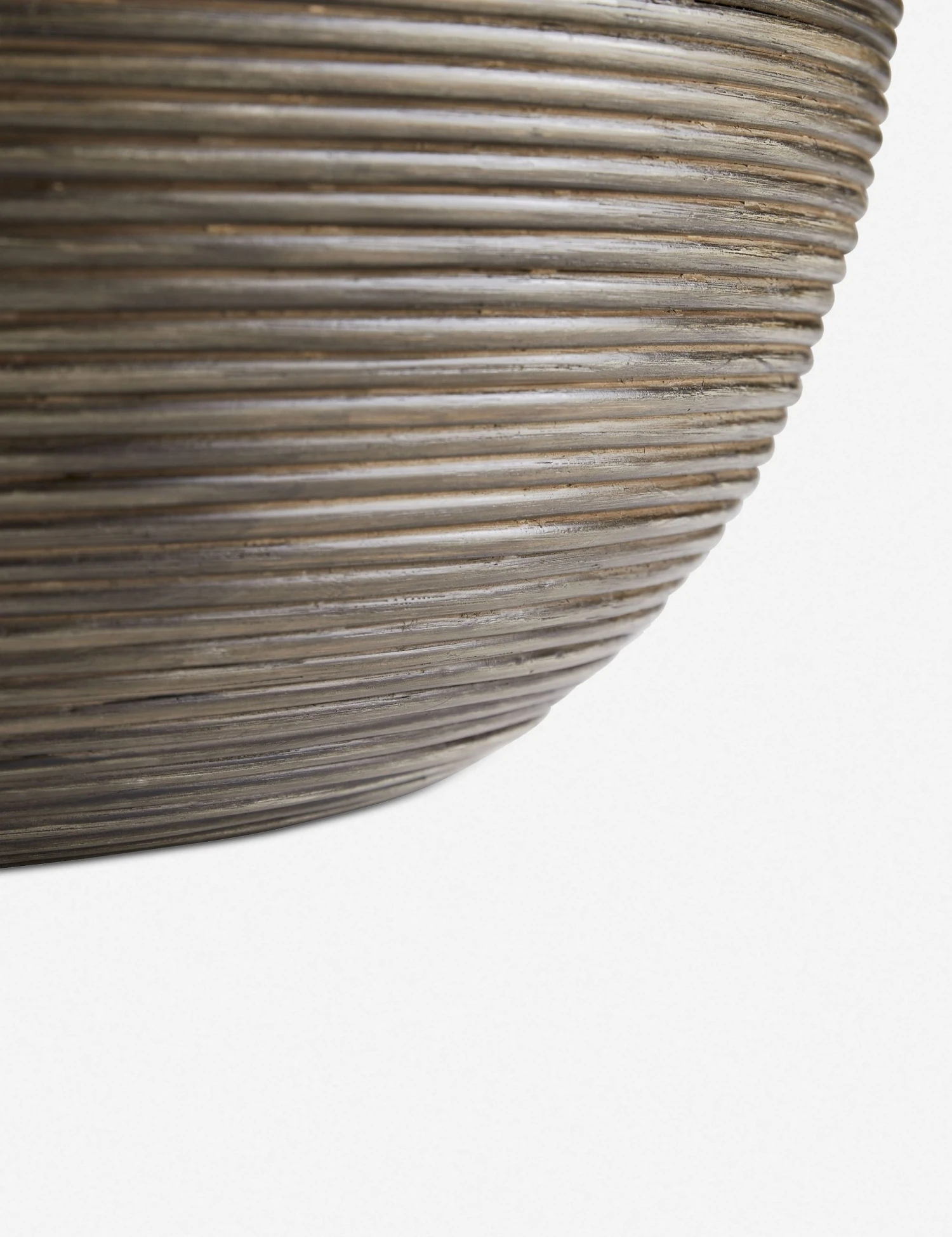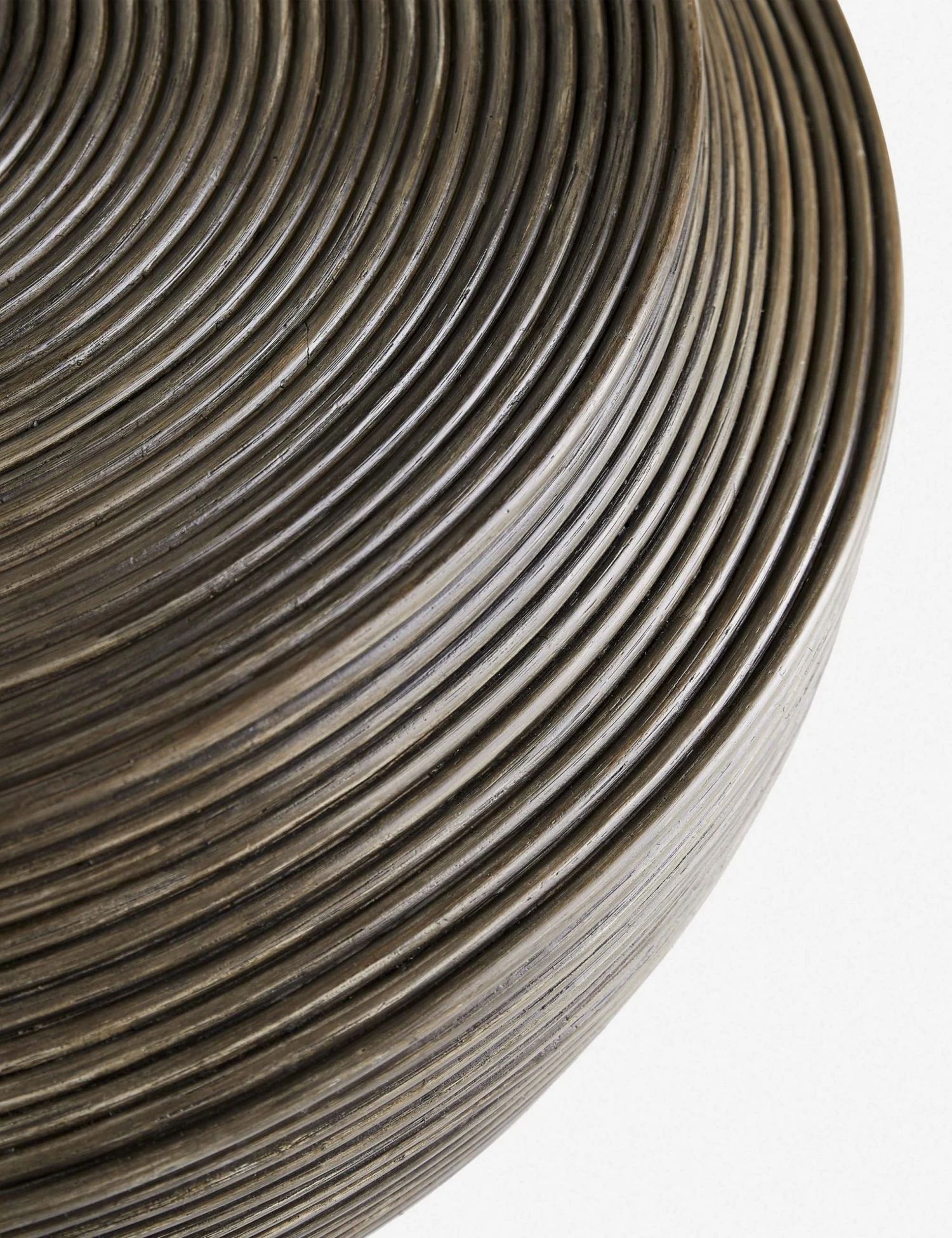 A stunning transitional living room table, this round coffee table is completely wrapped in coiled rattan with a sloping detail at the top for added dimension.