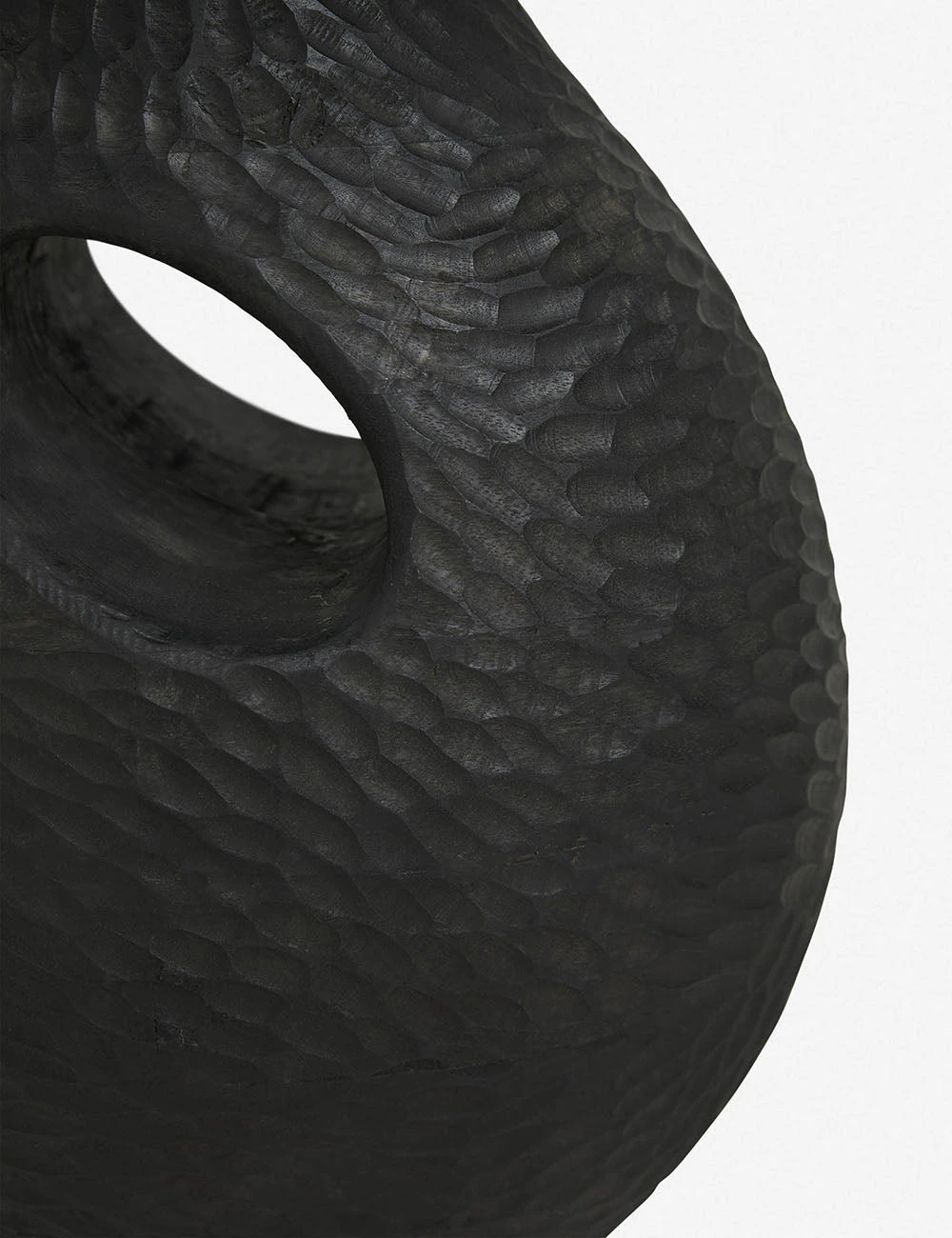 This hand-carved mango wood side table offers lots of textural appeal and stylishly displays its artisan craftsmanship. Its flowing design and a carved window through the base visually balance the blackened woodgrain finish. Style this end table as a grounding element for a moody decor.