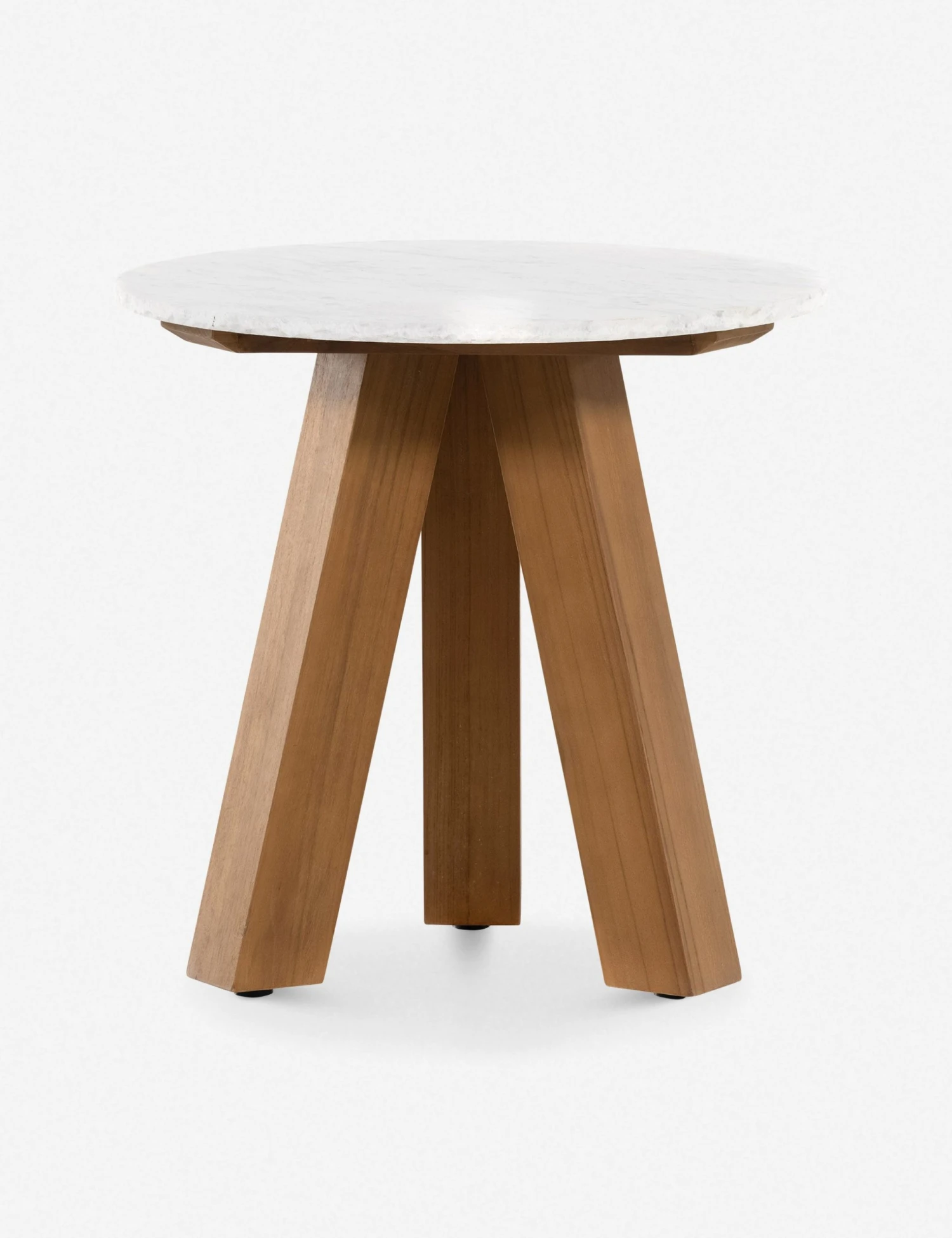 Mixed material design brings on-trend style with a distinctive silhouette to this marble and wood side table. The chunky splayed-leg base supports a round marble top with an unfinished edge for textural contrast. Float this luxe end table in your sunroom or outdoor lounge for a statement-making accent.