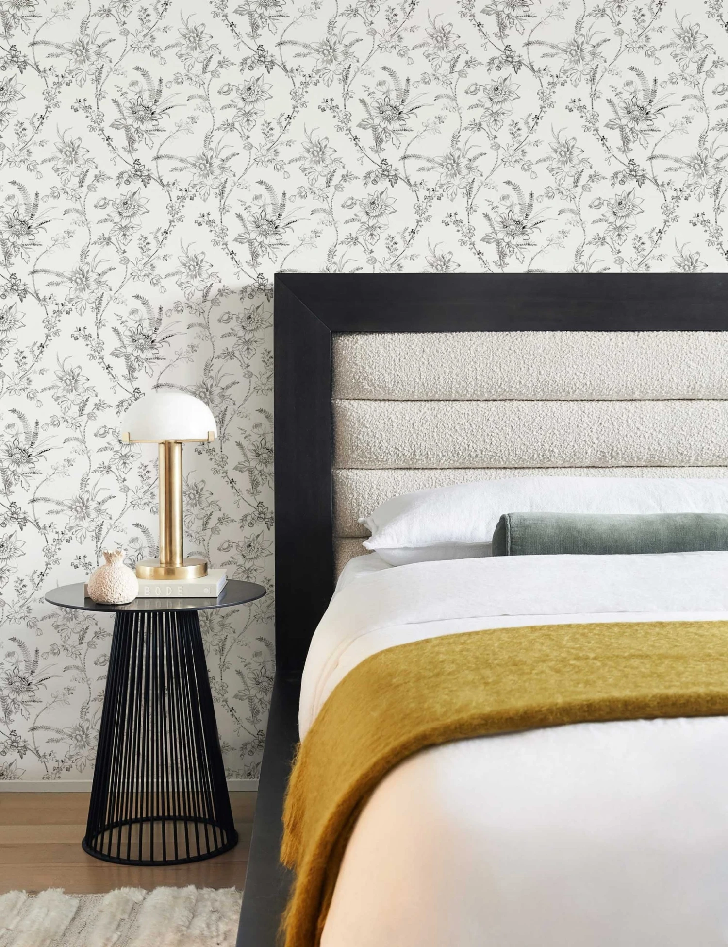 Vividly-styled bouquets and arrangements pop off a neutral backdrop for this floral Eloise Wallpaper. Pairing intricate, delicate line work with a monochromatic color palette creates a bold addition to your walls. Whether styled in a bedroom, home studio, or powder bath, we love it for adding polish to your space.