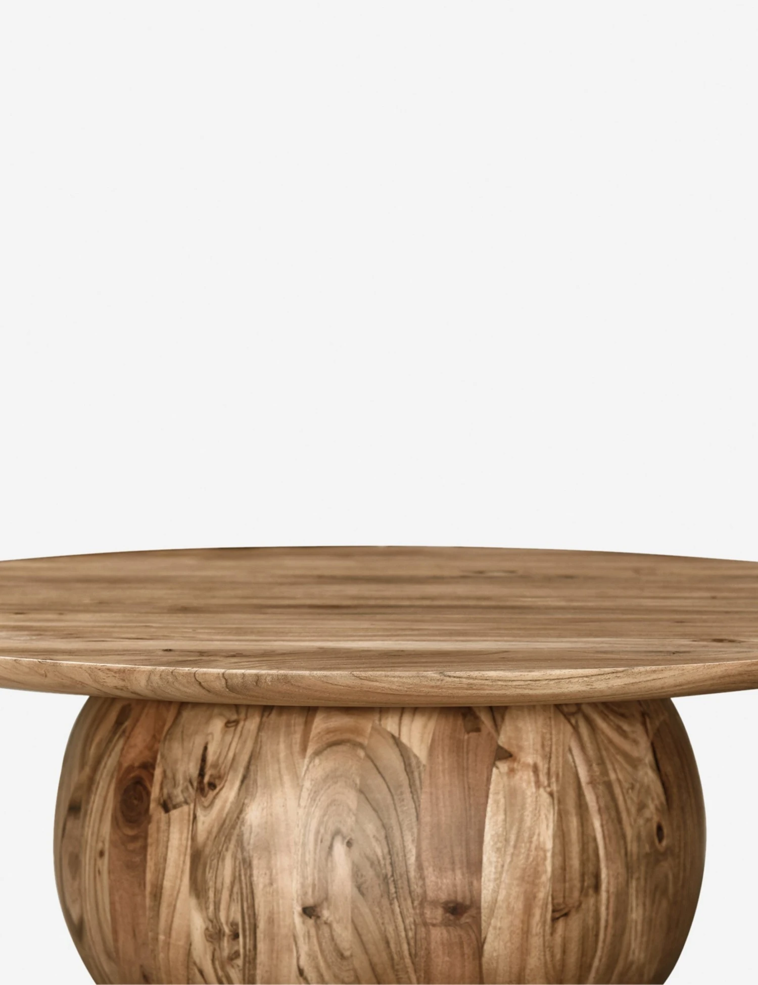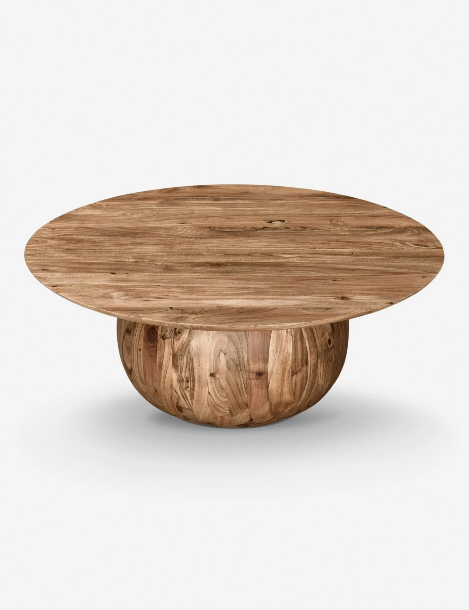 Constructed with solid wood in a classic silhouette, the Jace Round Coffee Table features a spherical base completed with a spacious table top, providing ample space for decor or beverages. The beautiful natural pattern of the acacia wood provides visual interest, making this the perfect coffee table for any living room design.