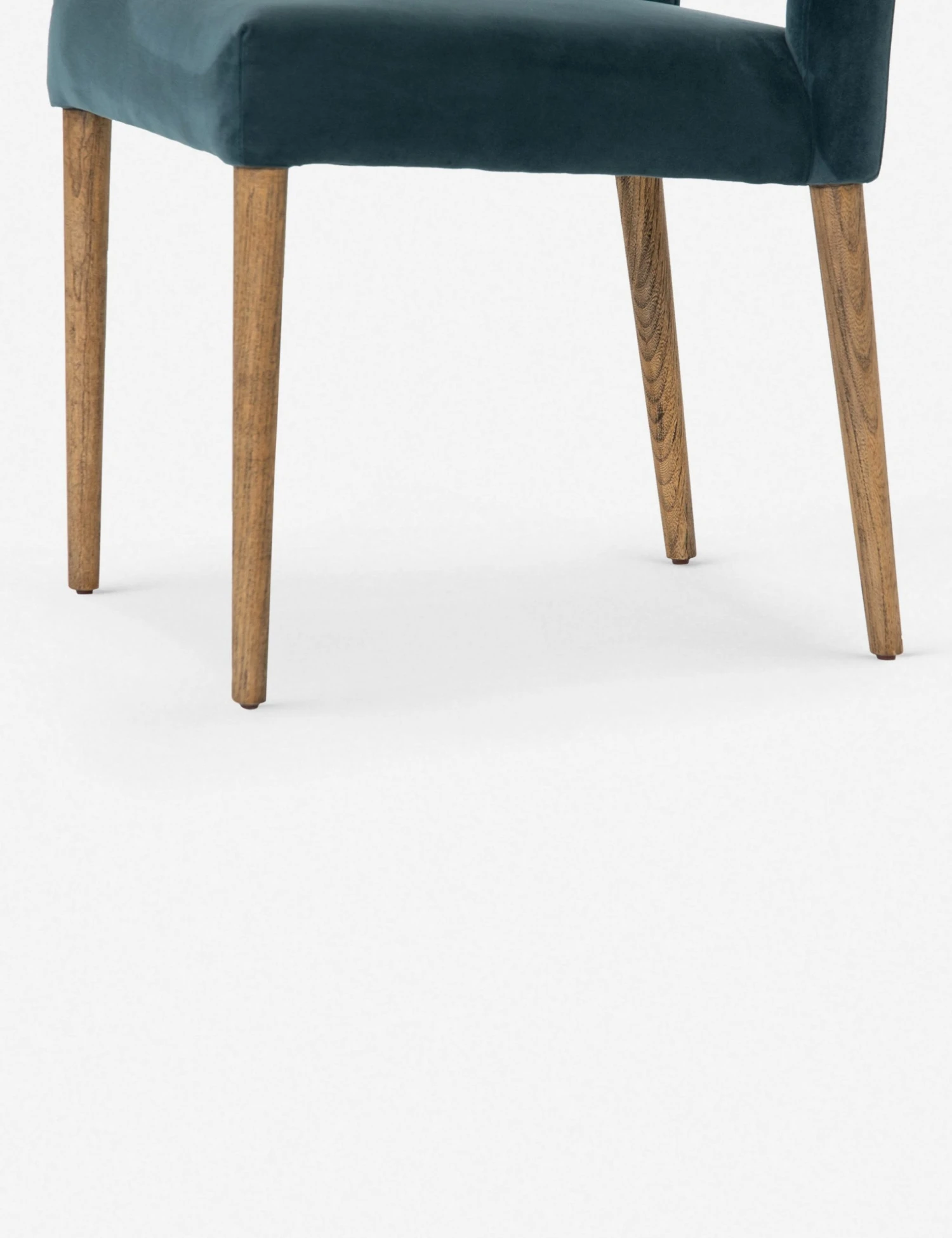 A contemporary dining chair that adds a luxe touch thanks to velvet upholstery. The wooden dowel legs keep the look accessible with a little mid-century inspiration.