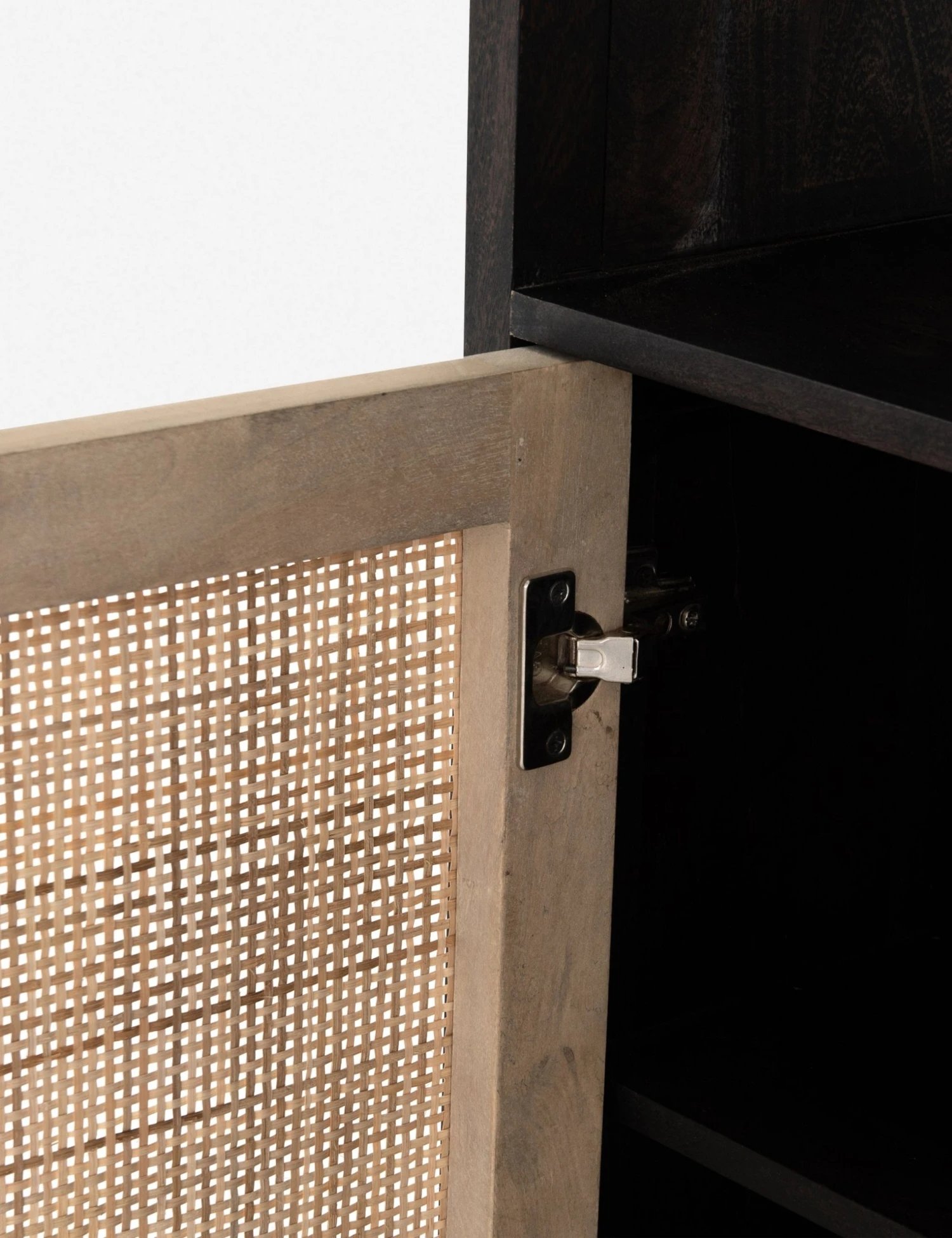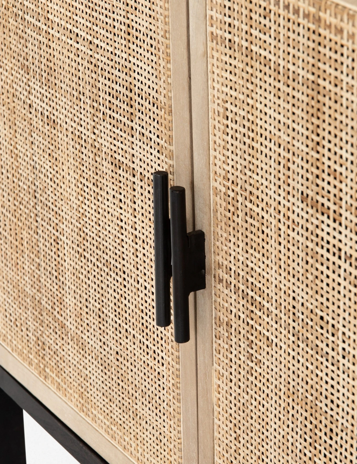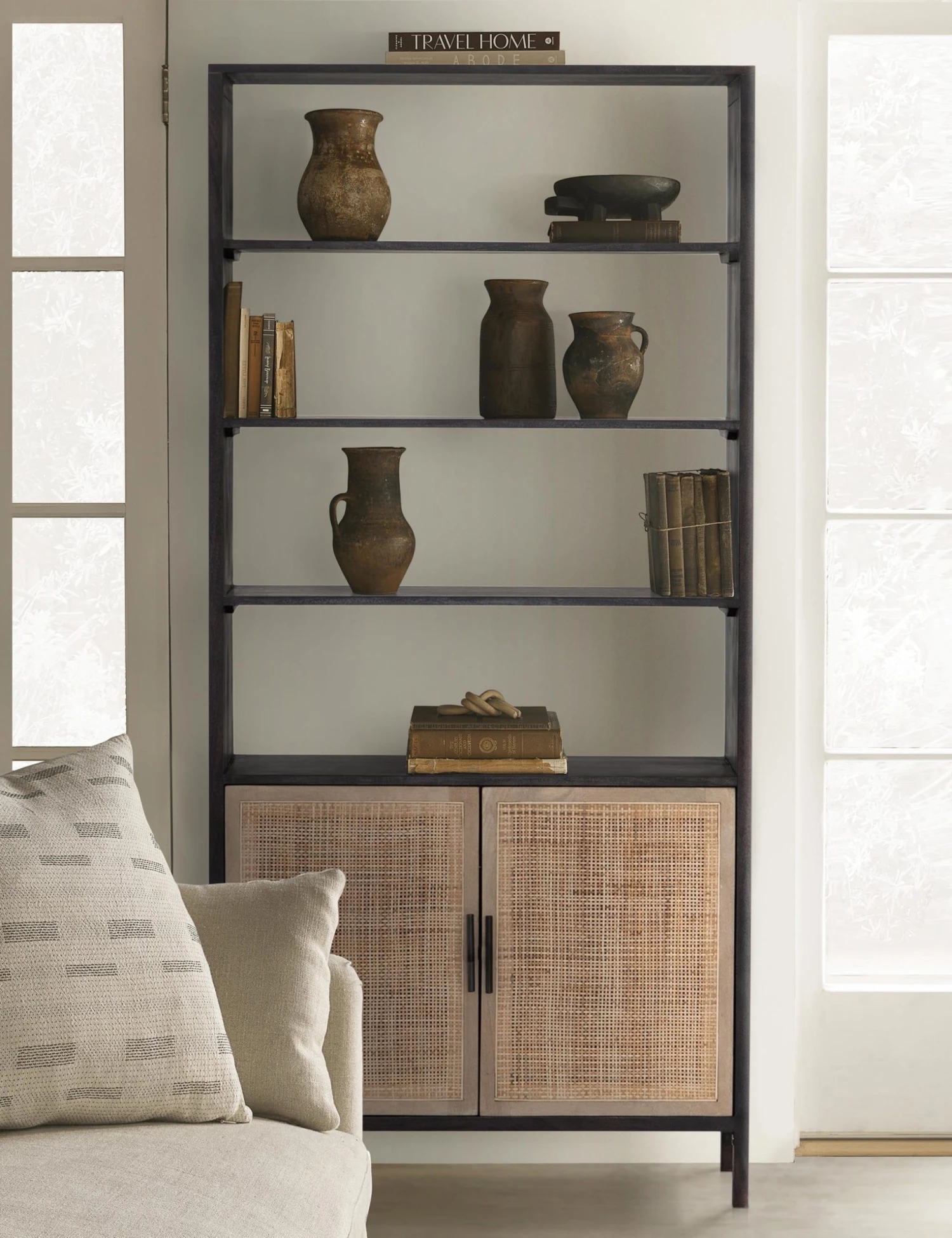 Thoughtfully designed with textural elements done in a high contrast palette, this bookcase also offers multiple open shelves perfect for storage and display. The black acacia wood gives a cool, modern look, while woven cane doors bring a touch of warmth. Don’t overlook the ample hidden storage behind those beautiful doors.