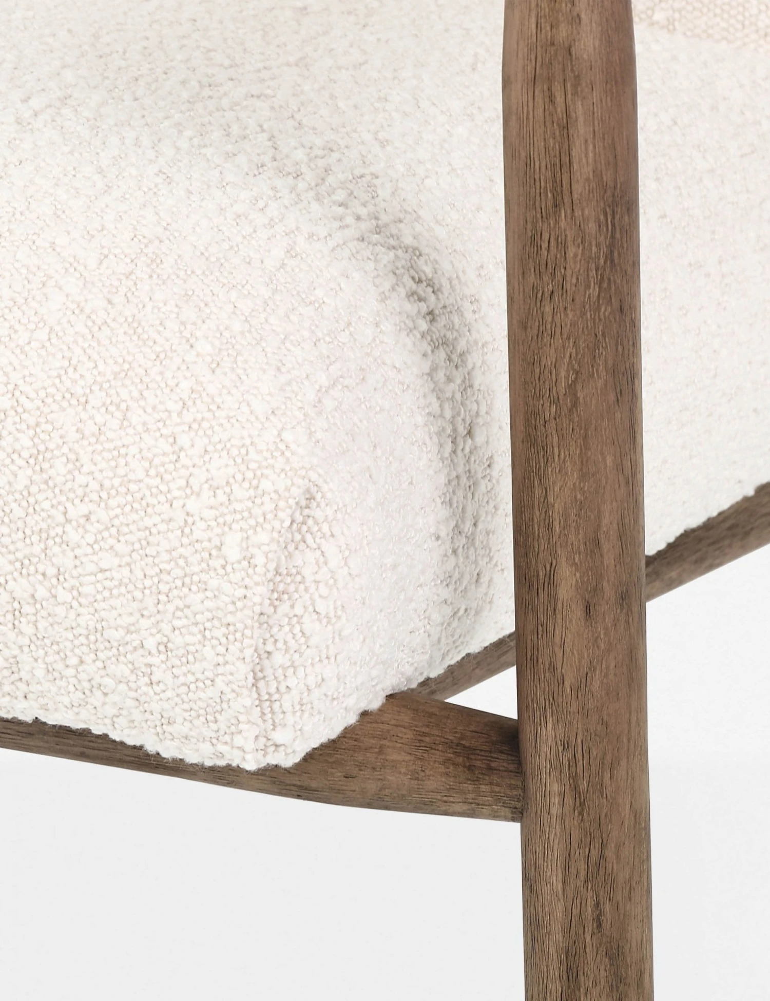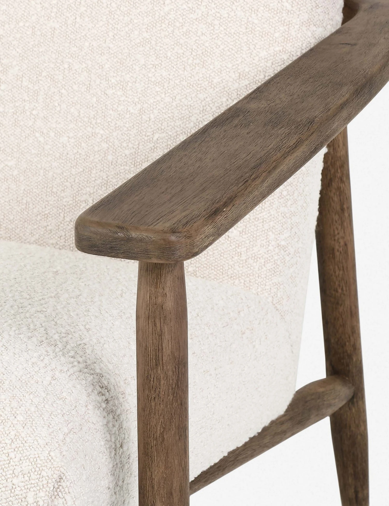 A mid-century modern chair that doesn’t take itself too seriously, featuring a low, angular profile. A distressed wood frame and dowel legs bring a touch of chalet-chic style to the look
