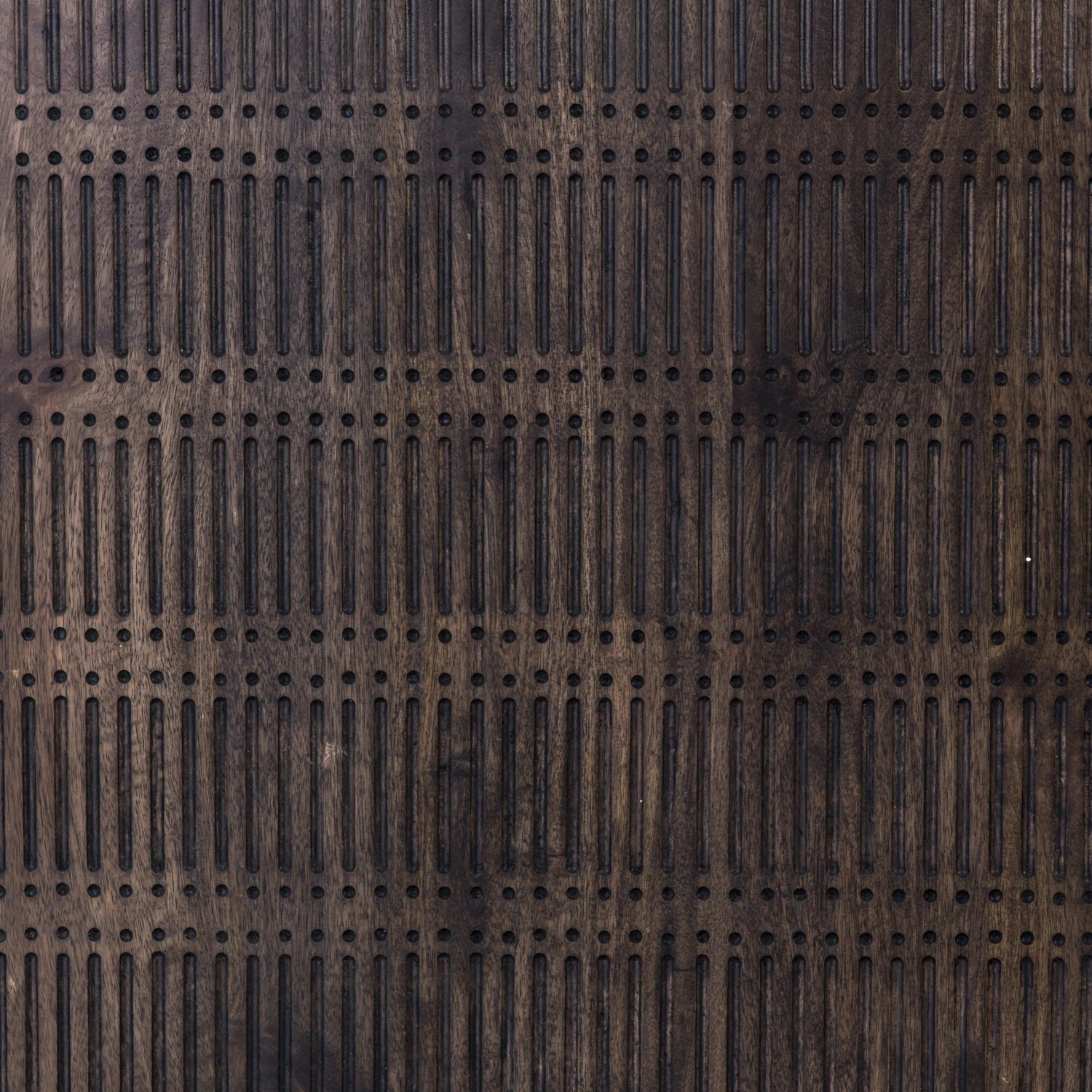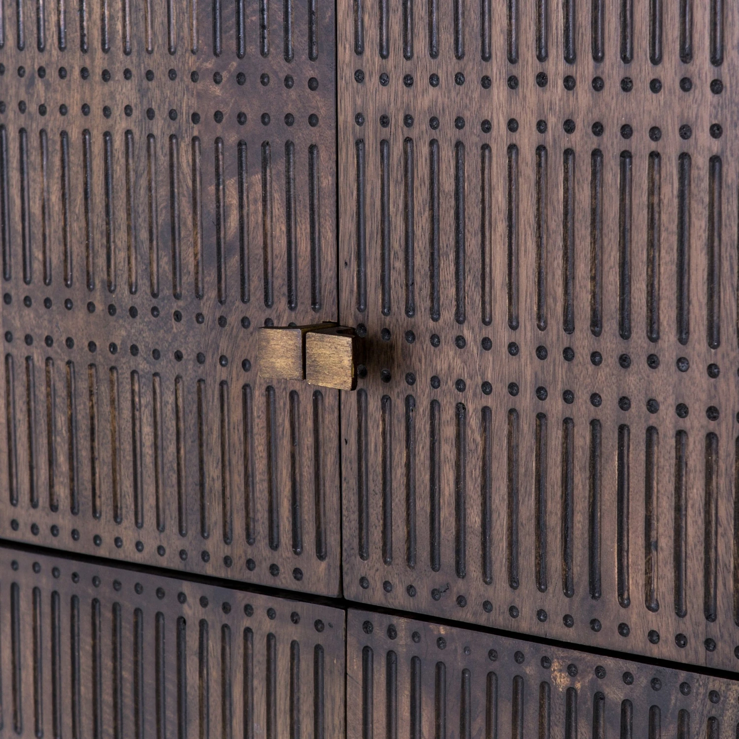 A carved geometric pattern takes this cabinet from piece of furniture to work of art. The richly-hued stain showcases the intricate work and a caged metal base keeps the piece from feeling too heavy. Pair with a Moroccan-style rug for a eclectic and global look.