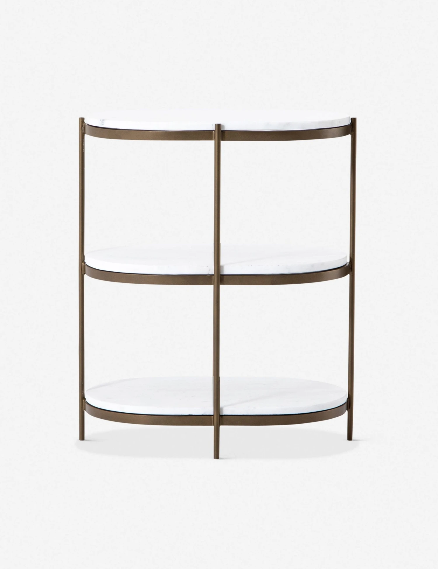 Boasting both vintage-inspired charm and a dose of modern luxury, this three-tiered nightstand is the perfect finishing touch to your feminine-chic bedroom. While the brass-finished iron has an industrial look, white marble and soft oval-shaped shelves soften the look for a stunning storage piece you’ll love!