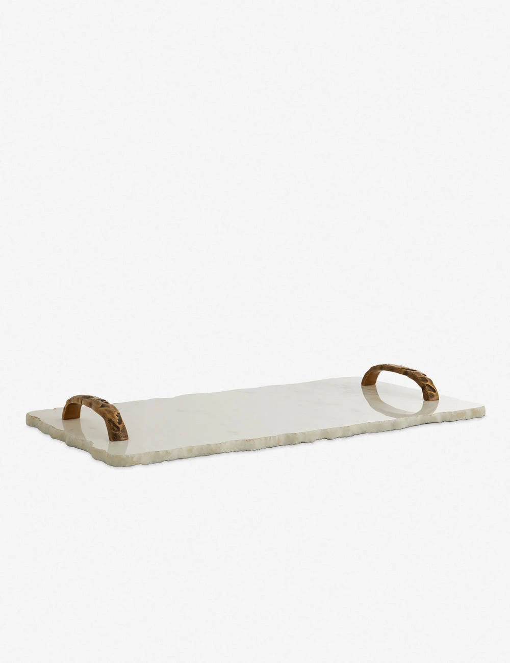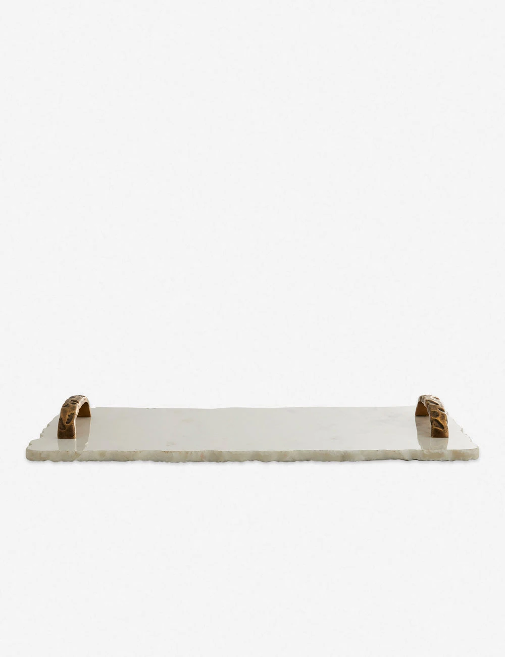 Bring a luxe signature to your coffee table or console with this unique tray. This functional accent is made from a beautiful chunk of white marble with distinctive veining in every piece. The raw edge adds to its organic appeal, complementing the sleek polish of the marble and cast brass-finished handles.