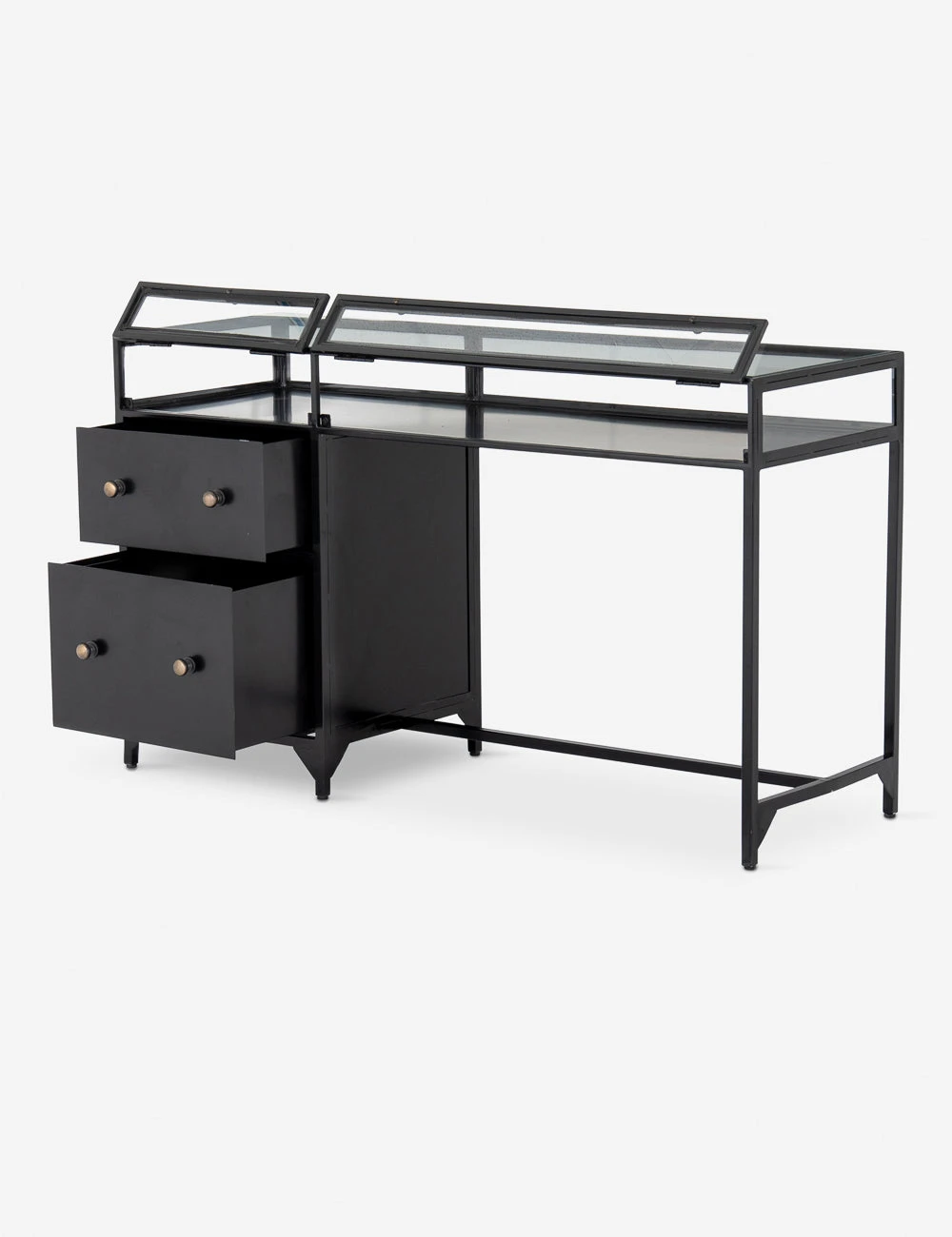 In a sleek nod to a shadow box design, this home office desk features an iron frame with glass enclosures for storage and display. The Malcom Desk includes a file drawer finished with brass knobs to offer a practical touch with an industrial edge.