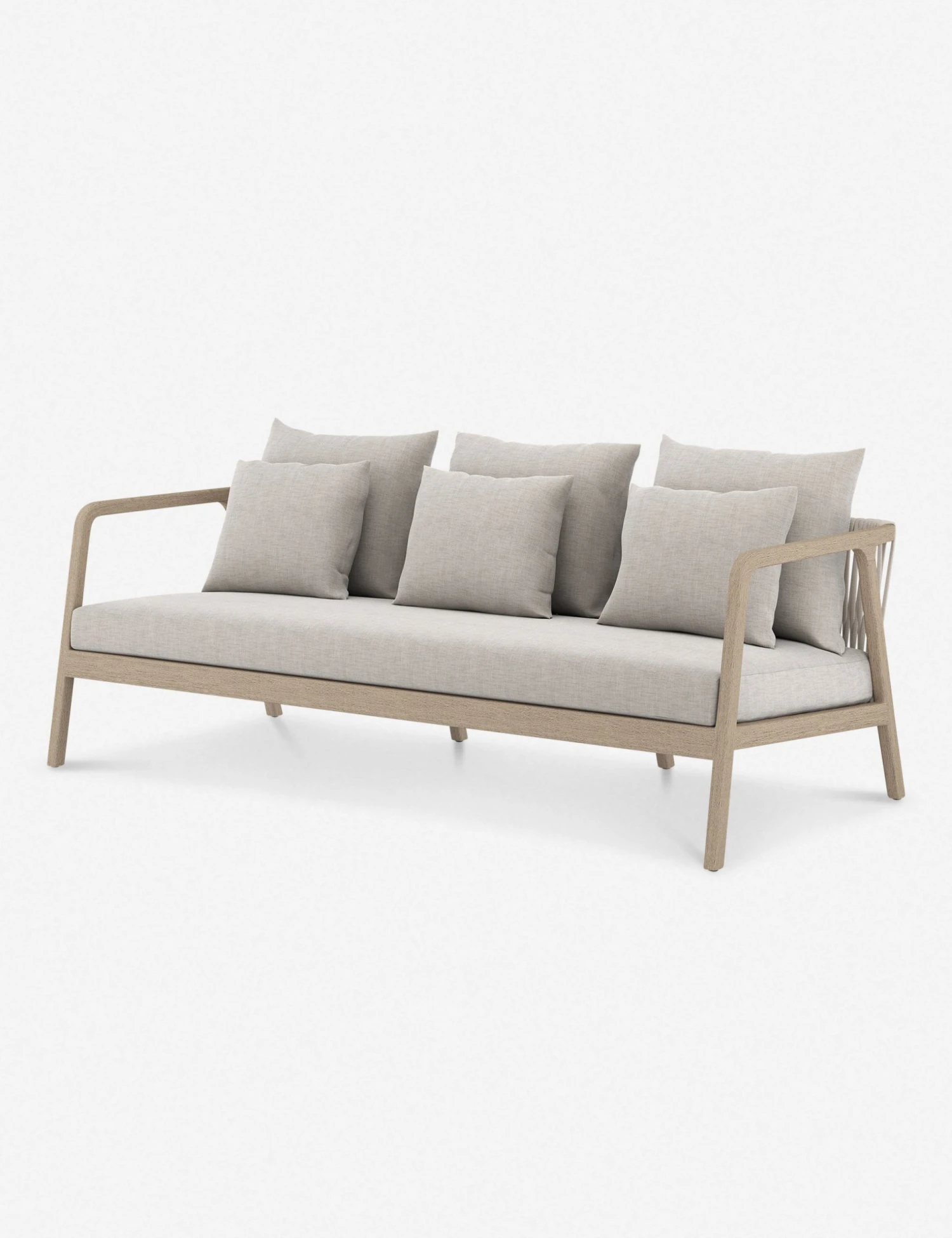 A streamlined design features an airy frame with sculptural lines in this transitional couch. The woven rope detailing and plush, weather-resistant cushions offer the perfect place to land for fresh-air lounging all year round. Anchor your outdoor space or sunroom with this simply refined sofa.