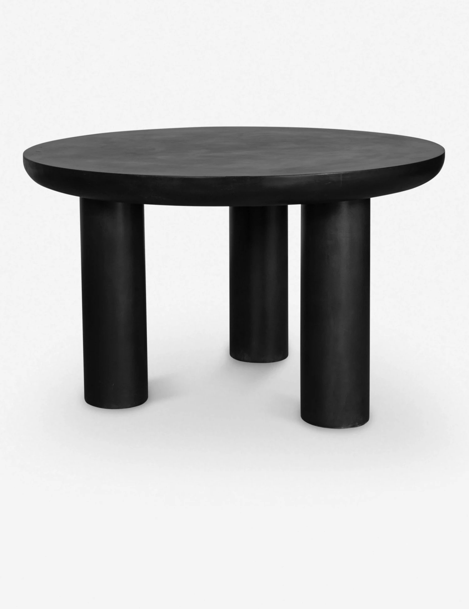 Sculptural lines soften and offer dramatic appeal to the sleek black-finished cement construction of this collection. This round dining table features a slab tabletop set on three pillar legs to give it a neoclassical look. Create a weighty focal point by styling this table on your patio or in an artfully modern dining space.