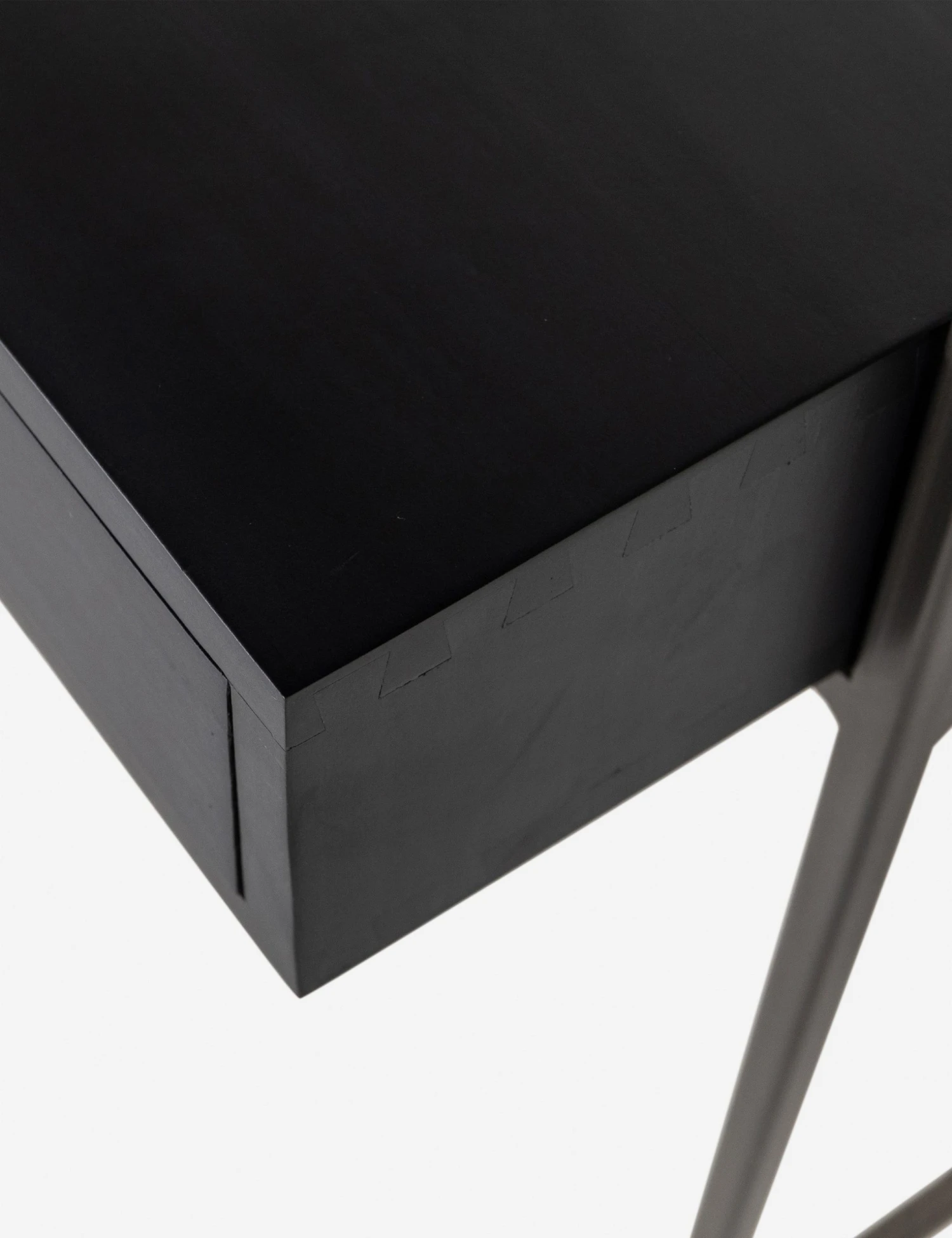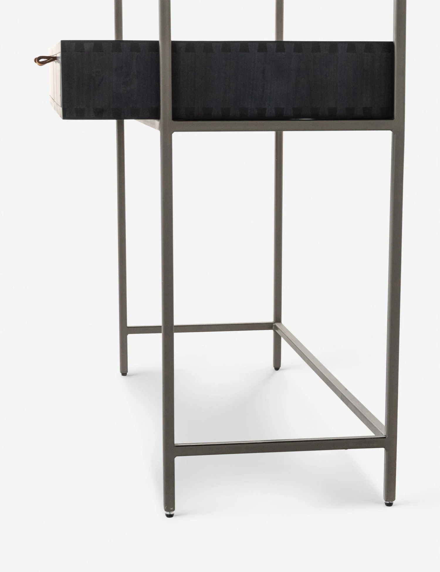 A slim iron frame lends this poplar desk and cabinet a floating look. Its dark finish, leather pulls, and modern silhouette offer a sleek desk space with plenty of surfaces and storage that can be decked with luxe decor and accents or left sparse for a touch of mid-century minimalism.