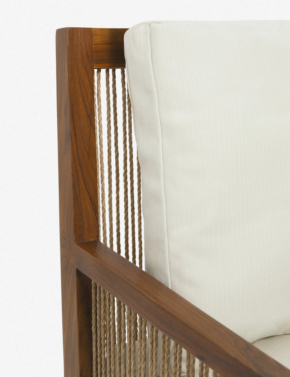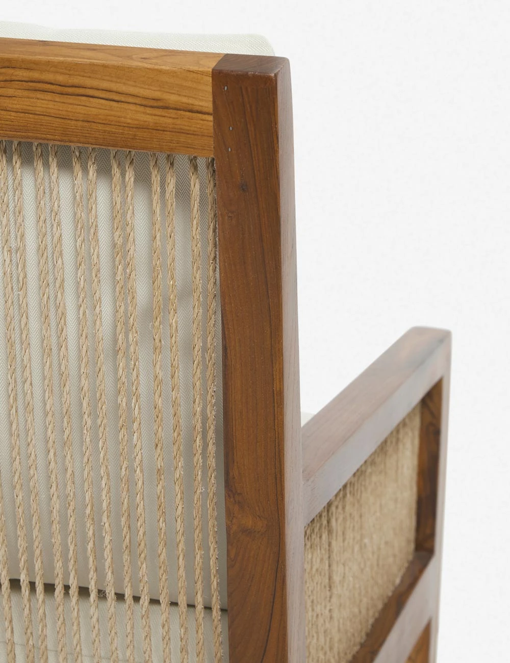 Constructed from reclaimed teak wood and featuring durable, easy-to-clean upholstery, this plush dining chair offers refined comfort with a practical touch. The clean-lined frame and rope detailing provide a striking textural profile. We love this versatile armchair design as a casual kitchen chair or outdoor seating.
