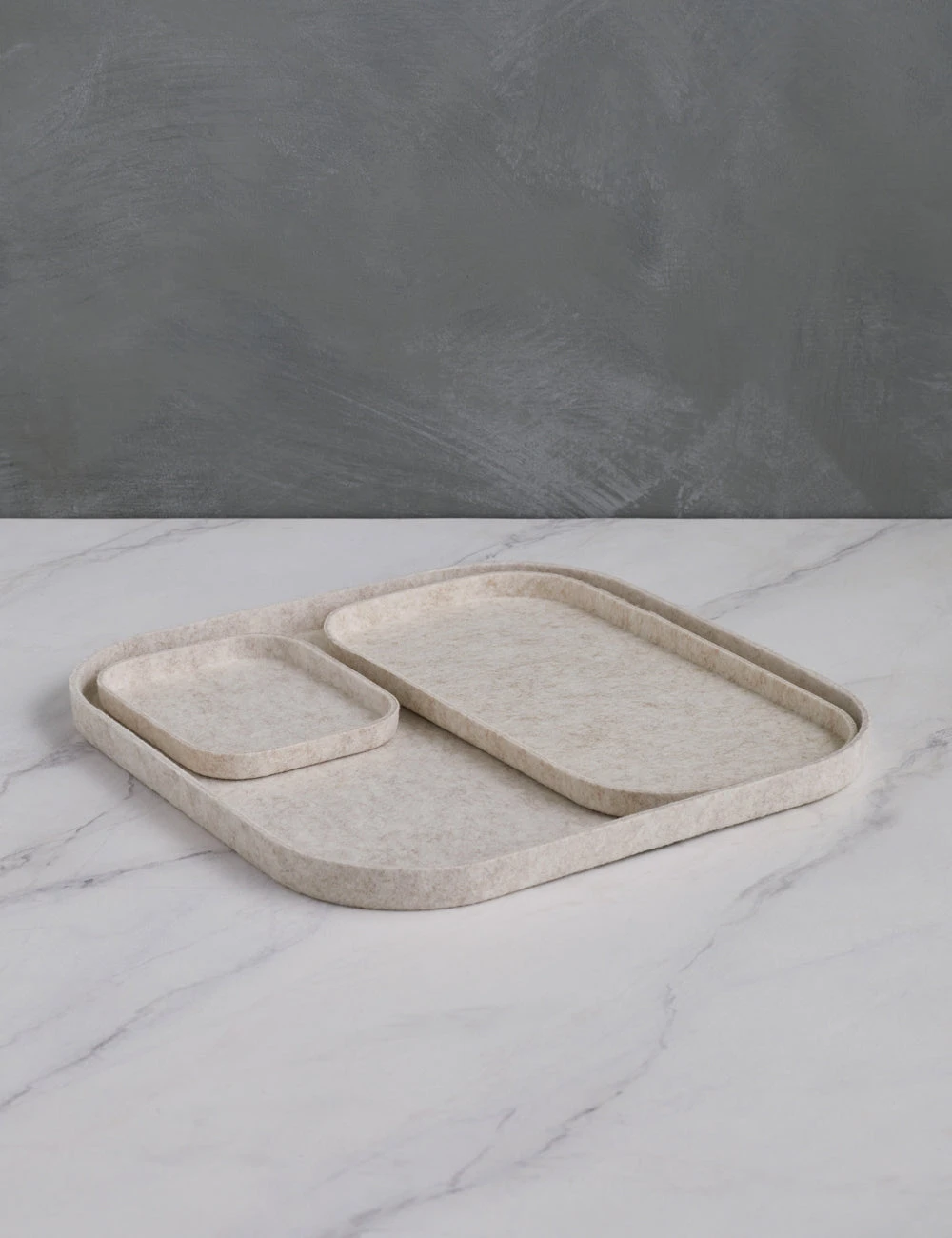 Turn your counter clutter into a thoughtful vignette with this set of trays. Each trio can nest in a tidy arrangement or sit separately, creating a dynamic and functional accent for your counter, vanity, or tablescape. With a solid form and soft felt touch, these trays can be hand washed or spot cleaned for easy care.