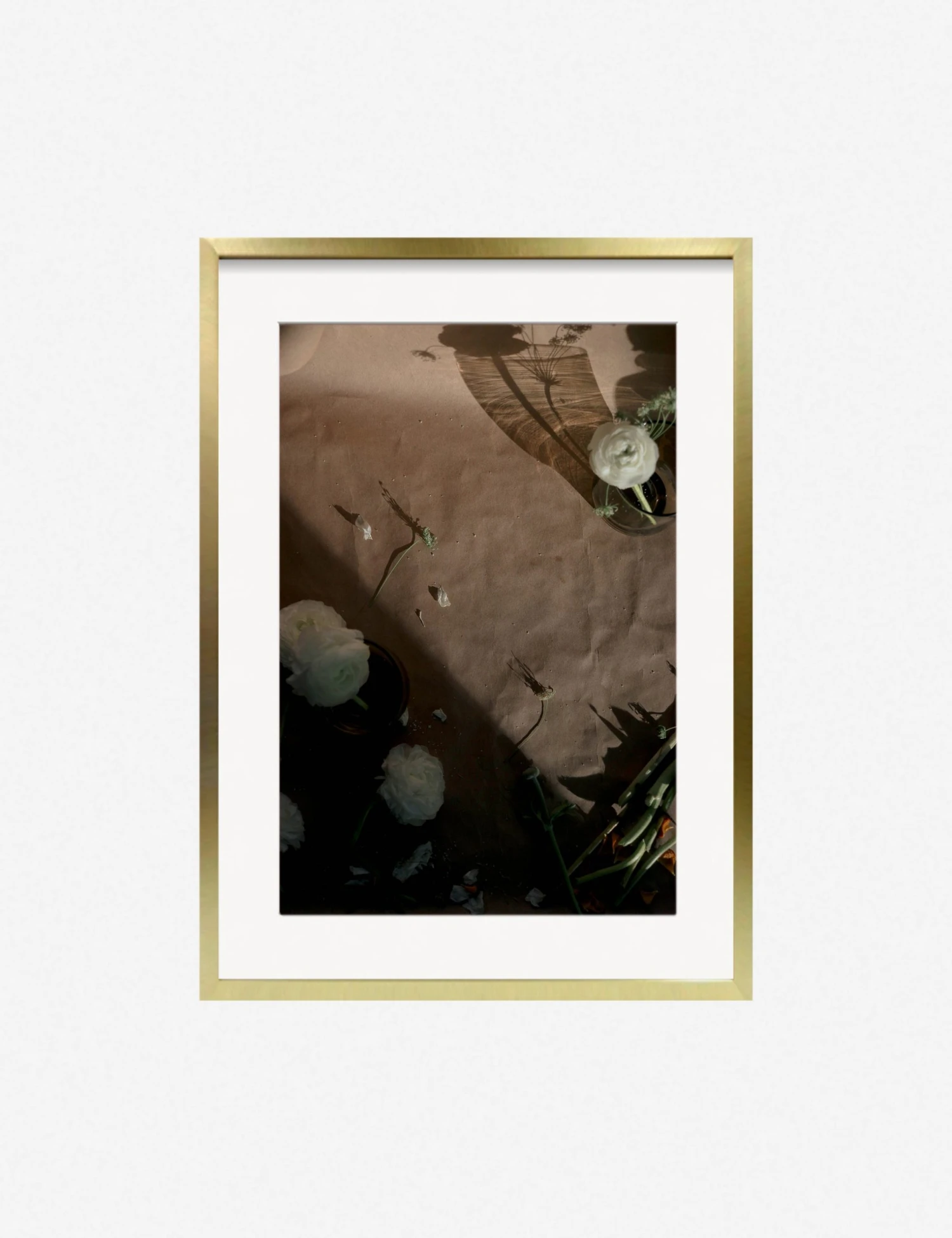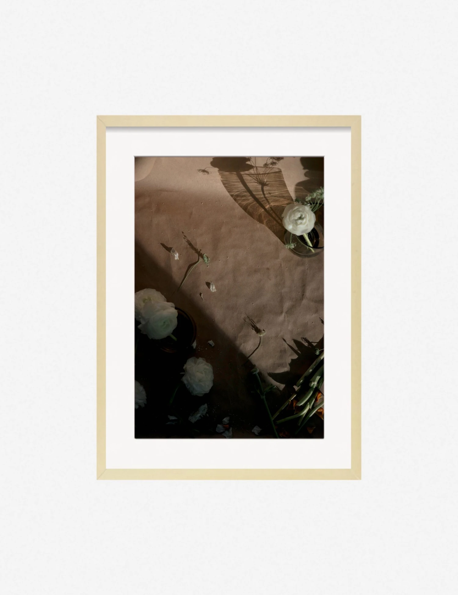 Winston-Salem-based multidisciplinary artist Ashley Johnson uses mixed media to create her staged portraits. Evocative use of negative space defines this still life from a series taken in the deep, stark shadows and warmth of the sunset, marked by strewn petals and vintage tinted glass. This wall art print was produced using archival inks to achieve long-lasting, true-to-color richness, outstanding resolution, and an even ink lay for a stunning gallery-quality addition to your art wall decor.