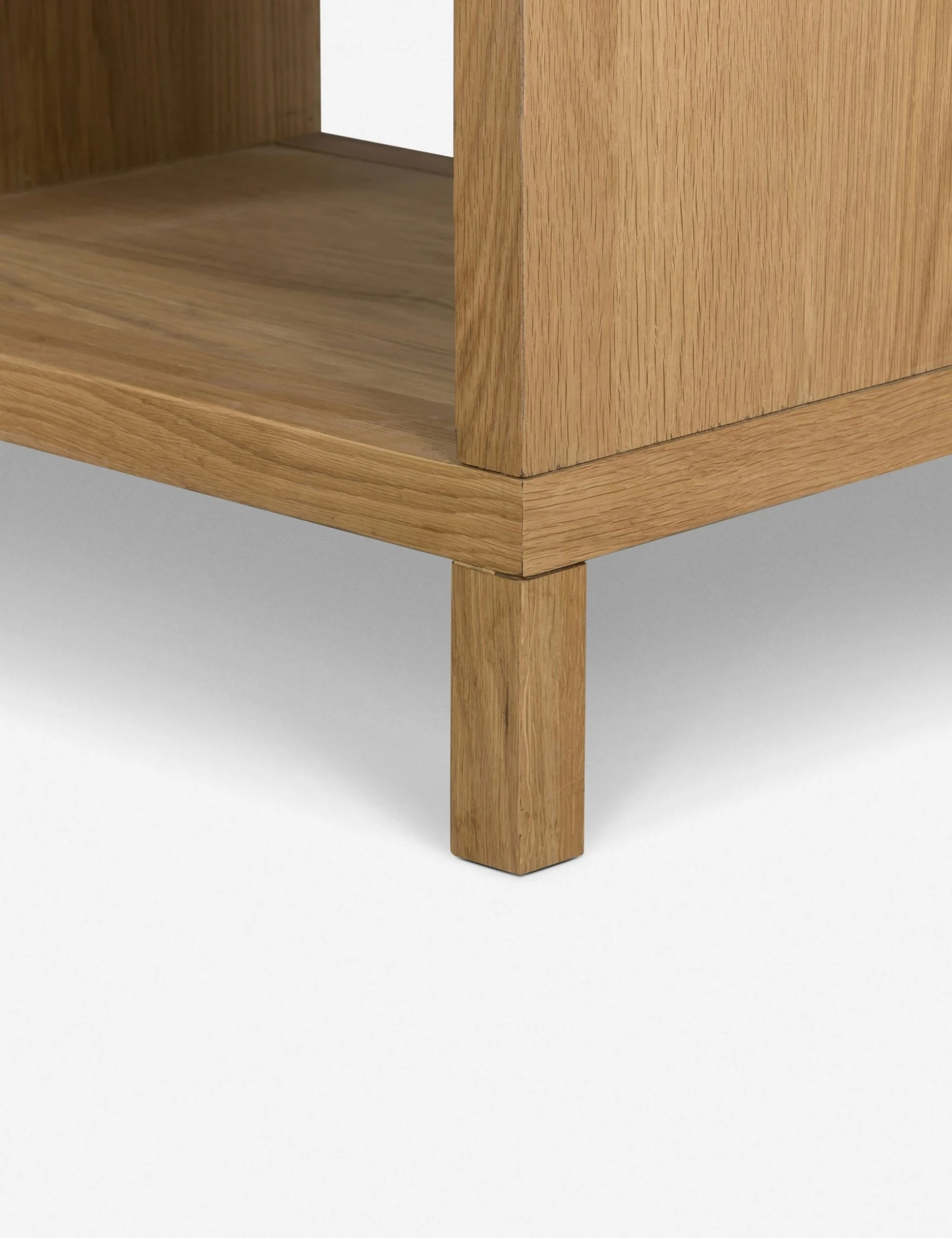 This wooden nightstand brings transitional elements to the forefront of your bedroom, thanks to a wicker caned oval on the single drawer. Featuring an open bottom shelf and simple squared legs, this bedroom side table gives you some extra storage space without sacrificing style.