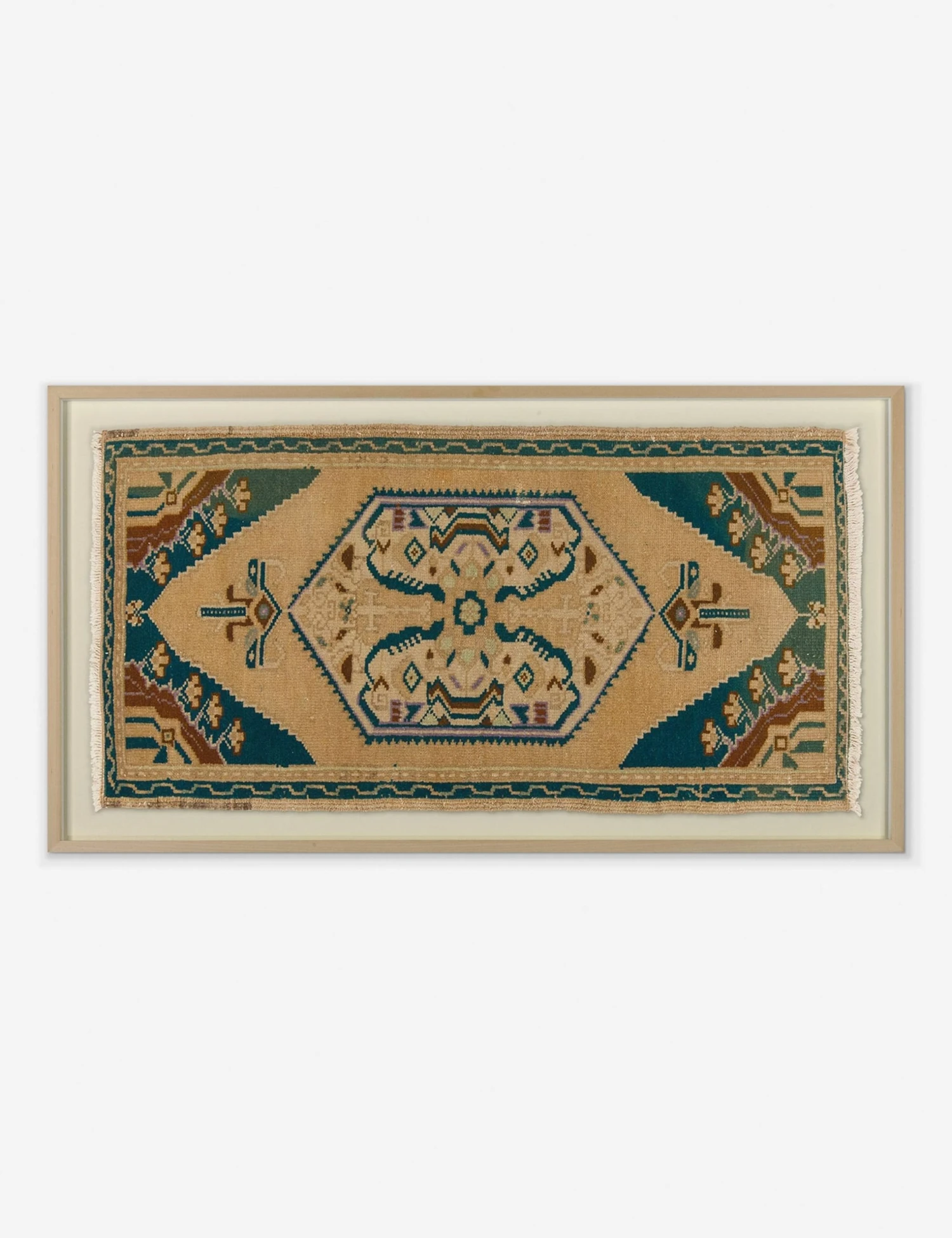 Instantly transform your walls with this limited-edition collection of framed textile wall art. Sourced from a small batch of vintage rugs, this textural and one-of-a-kind piece adds warmth, rich color, and stunning detail—making it an ideal focal point in your entry or living room above a console. Finished with a raw wood frame and simple mat to add a touch of polish to this artwork for your wall.