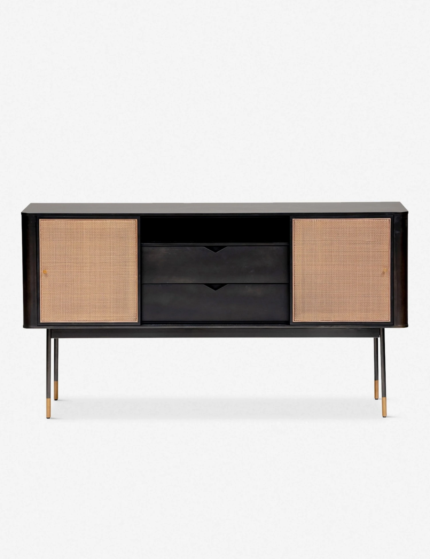Convenient. Sophisticated. So, so stylish. This functional sideboard is the perfect storage piece for transitional spaces with mid-century leanings, featuring wicker sliding doors, brass accents and two pull-out drawers in a timeless wooden frame.